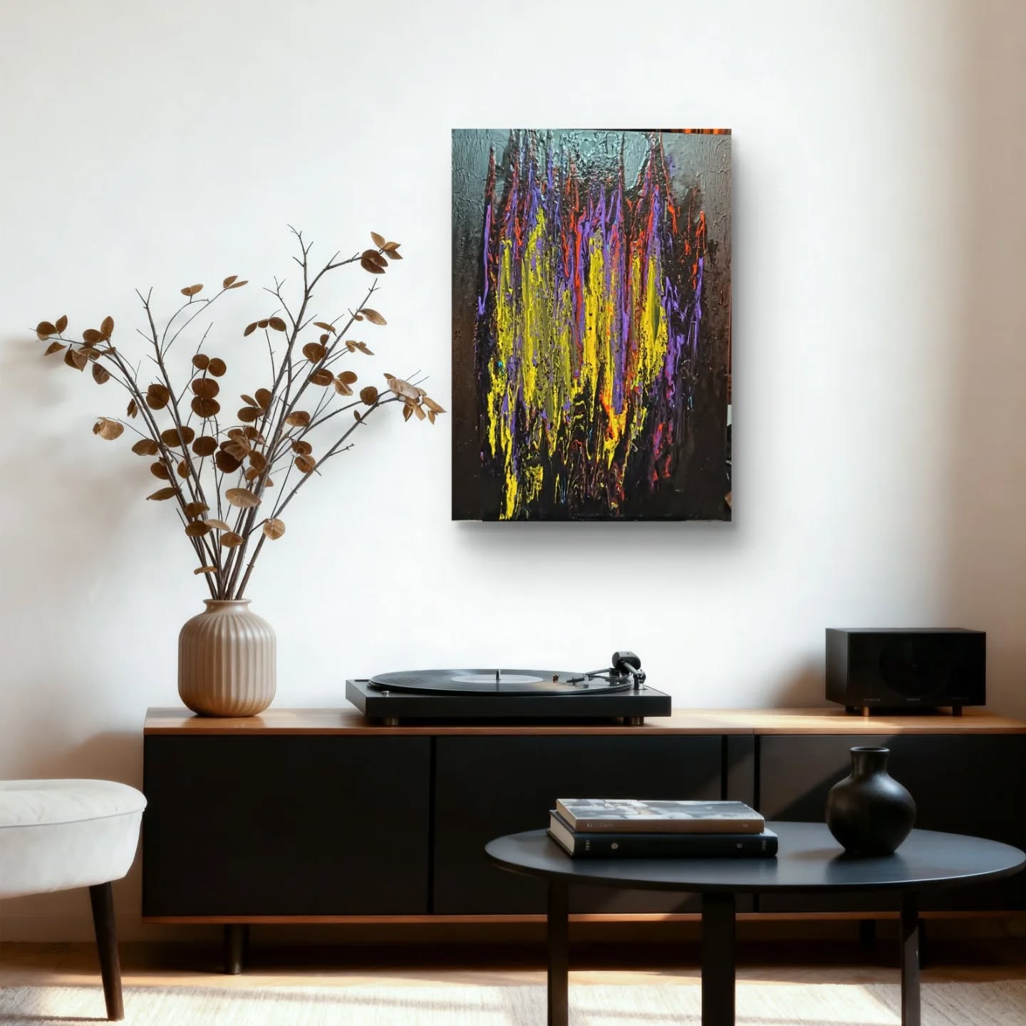 Tavolozza Vibrante negli Astratti: Nei dipinti astratti a colori pieni, la tavolozza è satura e audace. L'artista utilizza spesso colori primari e secondari in netto contrasto (blu elettrico, rosso acceso, giallo brillante, verde acido) per generare un'alta vibrazione emotiva e visiva ("abstract large painting," "abstract blue 2025").
